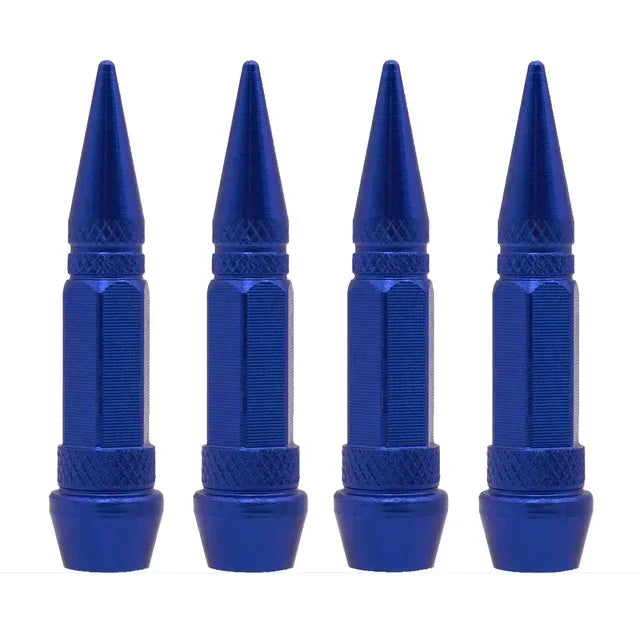 Give your wheels a custom look with this set of four bullet style valve stem caps. Made from lightweight aluminum, these pointed caps are a stylish and functional upgrade for your car, motorcycle, or bicycle.